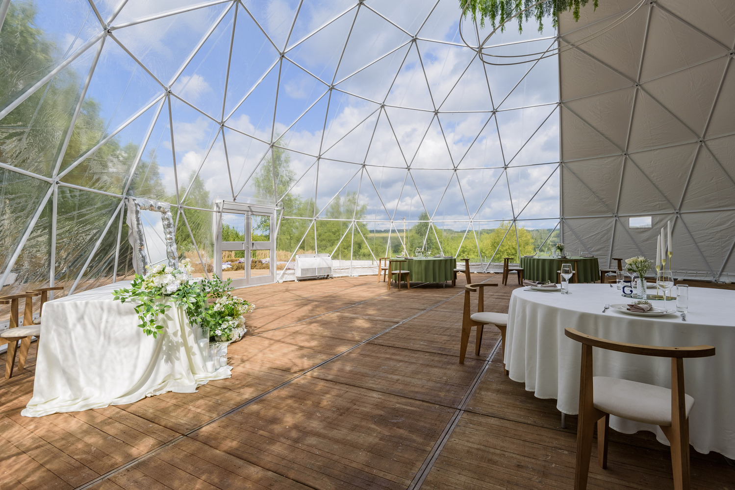 В аренду включены: белый арочный шатёр 180 м², веранда у леса 150 м², открытая терраса в лесу 70 м², кухня для кейтеринга 50 м², гримёрка, санузлы на 4 персоны, вся мебель (банкетные столы диаметром 180 см, стулья), кондиционеры и обогреватели, декор и фотозоны, парковка. При бронировании свадьбы — домик для новобрачных в подарок.